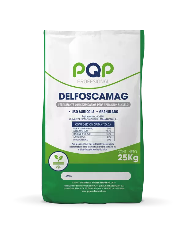 El Delfoscamag es un sulfato doble de calcio y magnesio enriquecido con fósforo que permite mantener el balance ideal y a la vez eleva el pH del suelo haciéndolo óptimo para la asimilación de nutrientes en el cultivo y como inhibidor de aluminio.